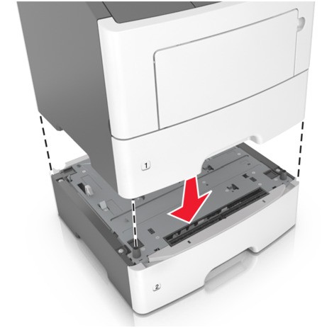 Entfernen Sie das gesamte Verpackungsmaterial aus dem Fachinneren.Schieben Sie das Fach in das Unterteil hinein.Legen Sie das Fach in die Nähe des Druckers.Richten Sie den Drucker am Fach aus, und setzen Sie den Drucker langsam auf das Fach.