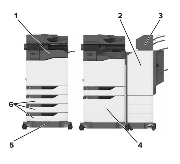 Sie können Ihren Drucker durch Hinzufügen eines optionalen 2200-Blatt-Fachs oder bis zu drei optionalen 550-Blatt-Fächern oder Fächern für Briefumschläge konfigurieren.