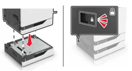 Wenn optionale Fächer bereits installiert sind, dann entsperren Sie sie vom Drucker, bevor Sie diesen anheben. Versuchen Sie nicht, den Drucker und die Fächer gleichzeitig anzuheben.Richten Sie den Drucker am optionalen Fach aus, und setzen Sie den Drucker einhörbareinrastet.