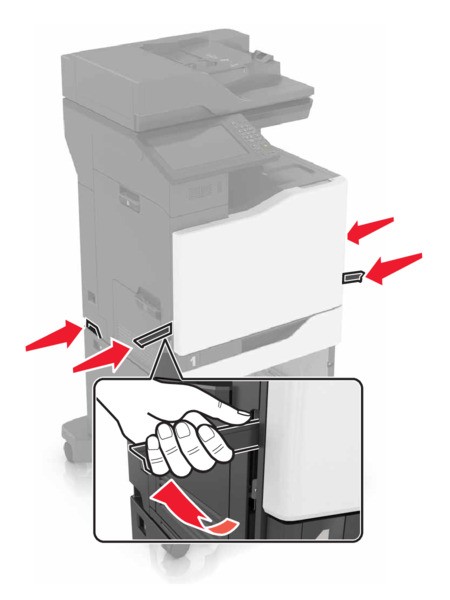 - Schalten Sie den Drucker aus.Entfernen Sie das Netzkabel von der Steckdose und anschließend vom Drucker.Nehmen Sie das optionale Fach aus der Verpackung, und entfernen Sie das gesamte Verpackungsmaterial.Heben Sie den Drucker mithilfe der seitlichen und hinteren Griffe an.Wenn der Drucker mehr als 18 kg wiegt (40 lb), sind zum sicheren Anheben mindestens zwei geschulte Personen notwendig.
