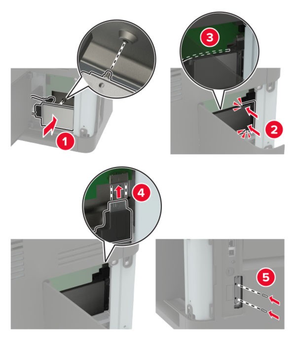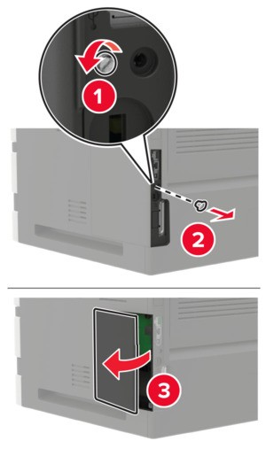 Wenn Sie nach der Einrichtung des Druckers auf die Steuerungsplatine zugreifen oder optionale Hardware oder Speichermedien installieren möchten, schalten Sie zunächst den Drucker aus, und ziehen Sie das Netzkabel aus der Steckdose, um das Risiko eines elektrischen Schlags zu vermeiden. Wenn andere Geräte an den Drucker angeschlossen sind, schalten Sie diese auch aus, und ziehen Sie alle Kabel vom Drucker ab.