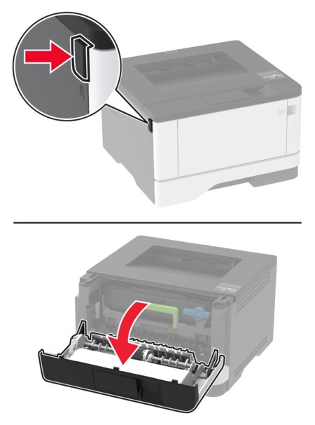 - Öffnen Sie die vordere Klappe.Berühren Sie den freiliegenden Metallrahmen des Druckers, bevor Sie den Drucker öffnen oder den Innenbereich des Druckers berühren, um Schäden durch elektrostatische Entladungen zu vermeiden.