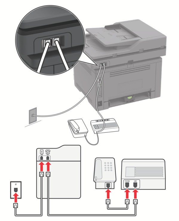 - Schließen Sie den Anrufbeantworter an den Telefonanschluss des Druckers an.