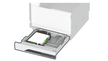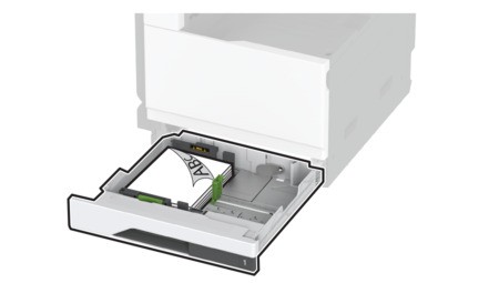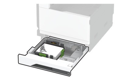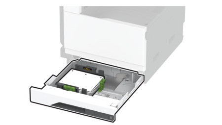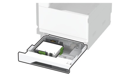 Schieben Sie das Fach in den Drucker.Stellen Sie bei Bedarf im Menü "Papier" sicher, dass die Einstellungen "Papierformat" und "Papiersorte" mit dem im Fach eingelegten Papier übereinstimmen.Wenn ein Finisher installiert ist, werden die Bilder beim Drucken um 180° gedreht.