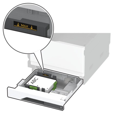 - Stellen Sie sicher, dass die Stapelhöhe die Markierung für maximale Papierfüllung nicht überschreitet. Durch Überladen des Fachs können Papierstaus entstehen.