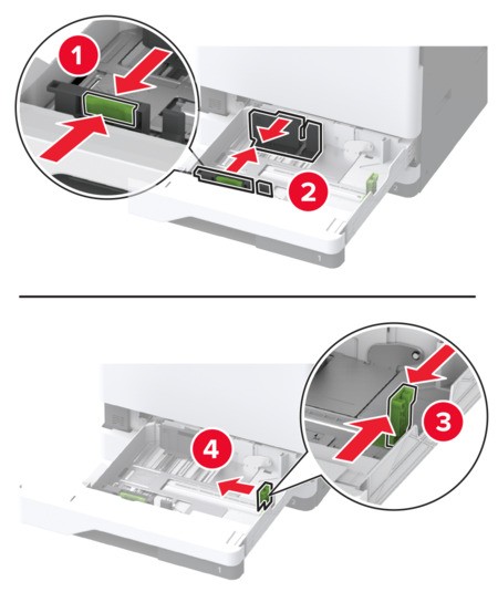 Passen Sie die Führungen so an, dass sie dem Format des eingelegten Papiers entsprechen.Schieben Sie die Führungen mithilfe der Markierungen unten im Fach in die richtige Position.