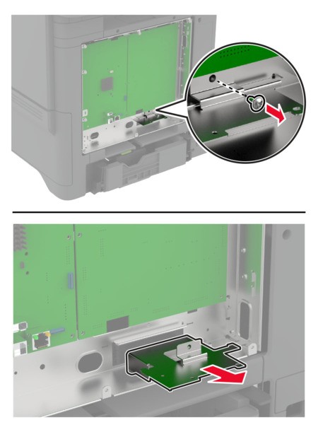 Wenn in Ihrem Drucker eine Faxkartenhalterung installiert ist, entfernen Sie sie.