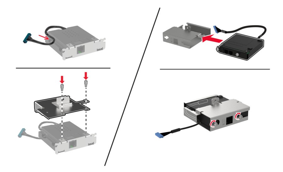 Bringen Sie die Faxkarte an der Halterung an.- Wenn die Faxkarte mit einer Halterung geliefert wurde, verwenden Sie diese Halterung.