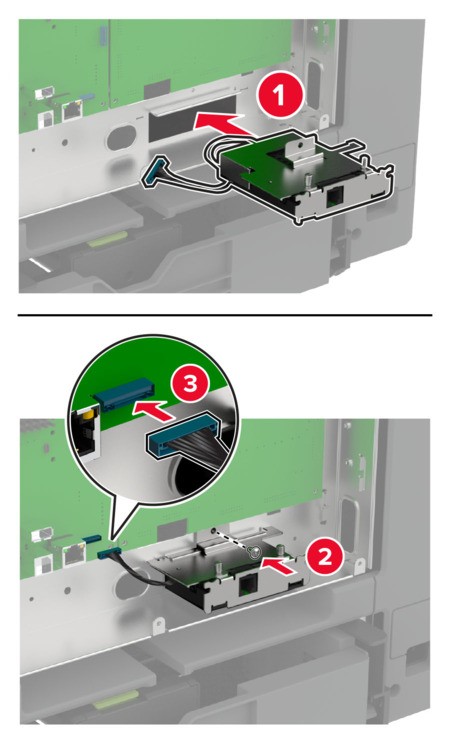 Setzen Sie die Faxkarte in den Drucker ein und schließen Sie dann den Stecker an die Steuerungsplatine an.