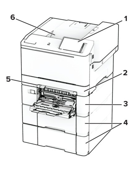 - Ein 650-Blatt-Doppelfach und bis zu zwei 550-Blatt-Fächer