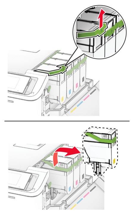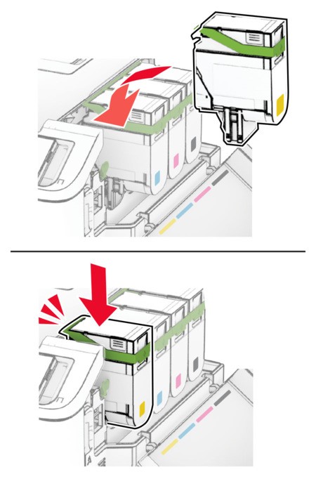 Nehmen Sie die neue Tonerkassette aus der Verpackung.Setzen Sie die neue Tonerkassette so ein, dass siedass ereinrastet.