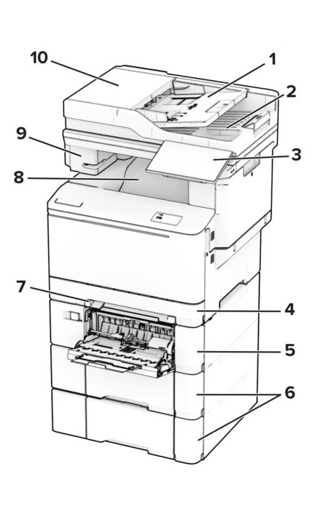- Ein 650-Blatt-Doppelfach und bis zu zwei 550-Blatt-Fächer