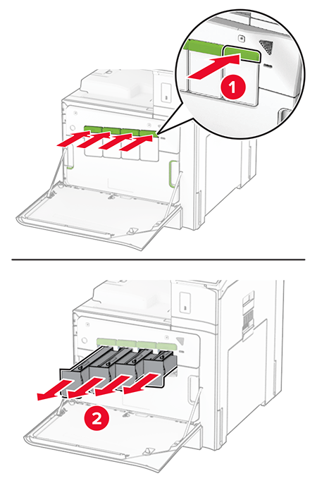 Wiederholen Sie die Schritte 3 und 4 dreimal pro Druckkopf.Setzen Sie die Tonerkassetten ein.
