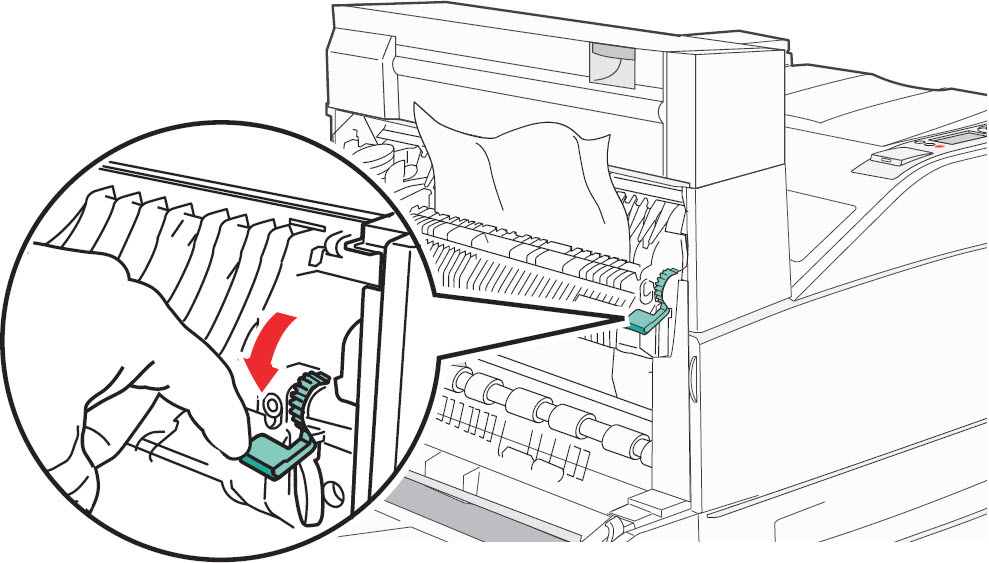 2 | If the paper is visible, pull the jam up and toward you. Slowly remove the jammed paper to avoid tearing it. If the paper is not visible, then proceed to the steps below.![]() f the jam does not move immediately, stop pulling. Push down and pull thegreen lever to make it easier to remove the jam. Ensure all paper fragments are removed. Do not touch the center of the fuser unit. Doing so will damage the fuser. Also, to prevent any possible damage to the fuser, please do not use sharp objects (i.e., screwdrivers) in removing jammed paper. |