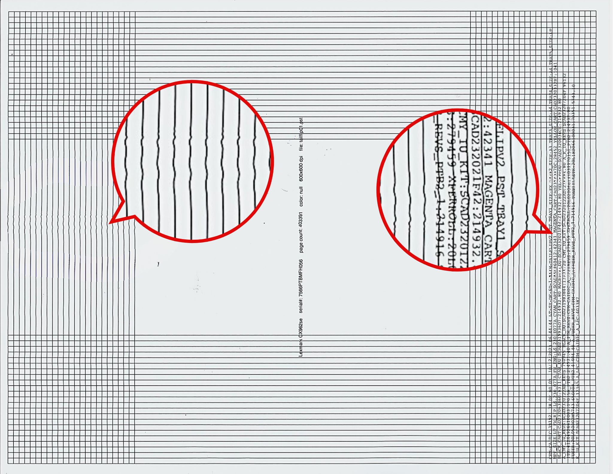 Vertical lines and text appear wiggly, wavy or distorted when printing in landscape orientation. See the following sample image.