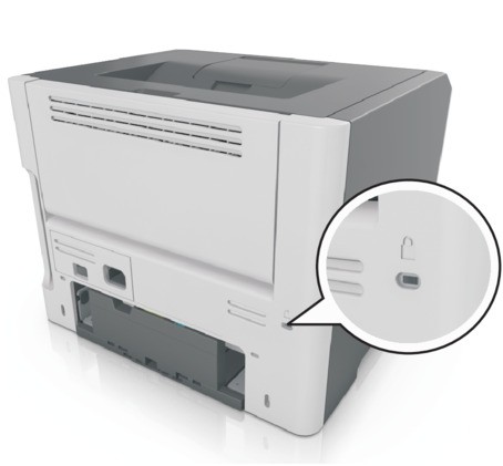 The printer is equipped with a security lock feature. Attach a security lock compatible with most laptop computers in the location shown to secure the printer in place.
