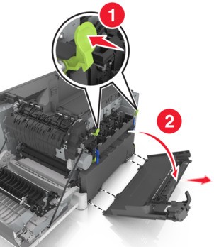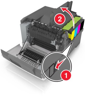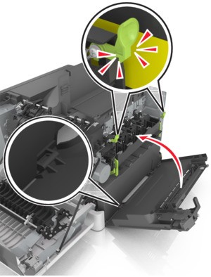 - Open the front door.The inside of the printer might be hot. To reduce the risk of injury from a hot component, allow the surface to cool before touching it.