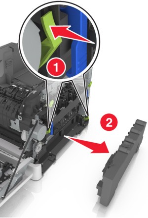 Press down the blue lever, and then grasp the green handles on the sides to pull out the imaging kit.