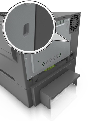 The printer is equipped with a security lock feature. Attach a security lock compatible with most laptop computers in the location shown to secure the printer in place.