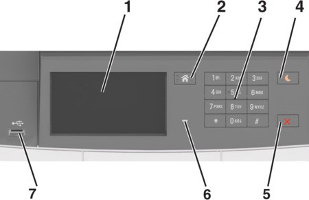 7 | USB port | Connect a USB a flash drive to the printer. Only the front USB port supports flash drives. |