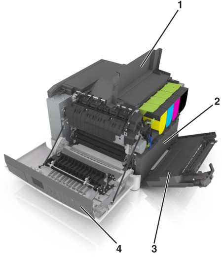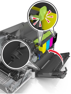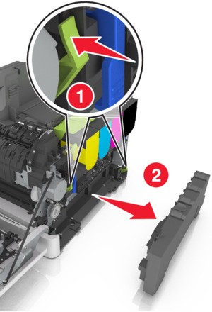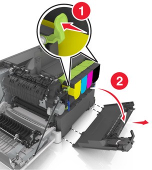 - Unpack the replacement waste toner bottle.Open the front door.The inside of the printer might be hot. To reduce the risk of injury from a hot component, allow the surface to cool before touching it.