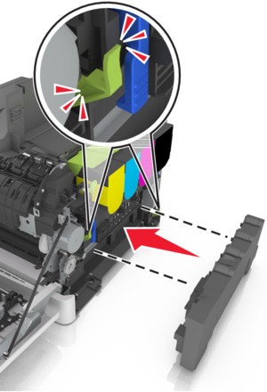 Pack the used waste toner bottle.For more information, see Recycling Lexmark products.Insert the replacement waste toner bottle.