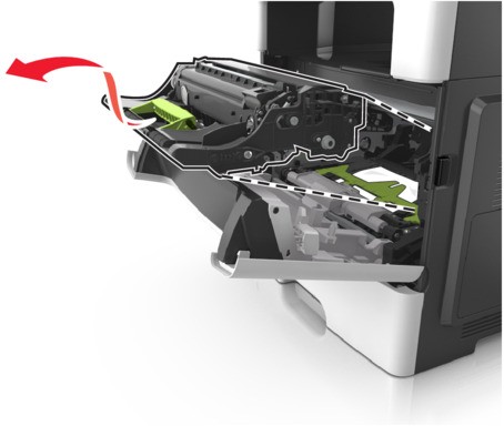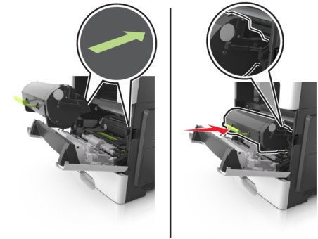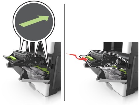 Insert the imaging unit.Use the arrows inside the printer as guides.
