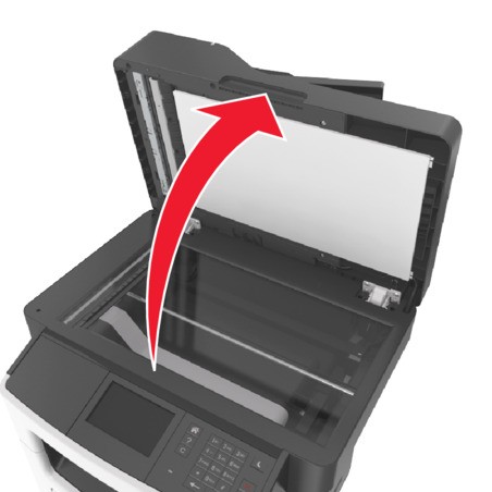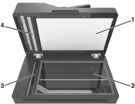 1White underside of the scanner cover2Scanner glass3ADF glass4White underside of the ADF coverClose the scanner cover.