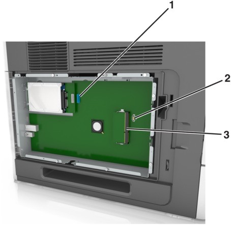 1Lexmark™ Internal Solutions Port or printer hard disk connector2Option card connector3Memory card connectorAlign the screws with the holes on the shield, and then reattach the shield.