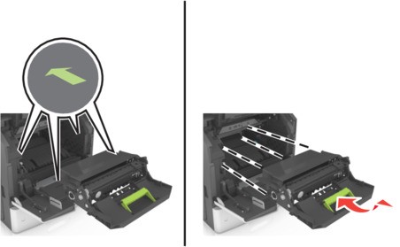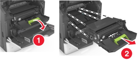 Lift the green handle, and then pull out the imaging unit from the printer.