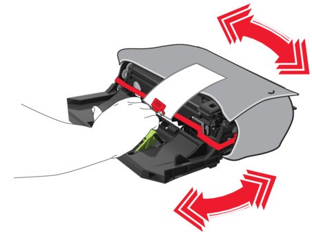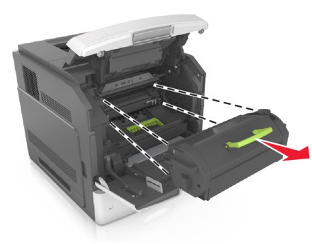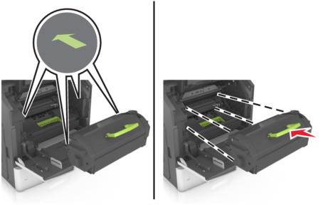 Insert the toner cartridge into the printer by aligning the side rails of the cartridge with the arrows on the side rails inside the printer.