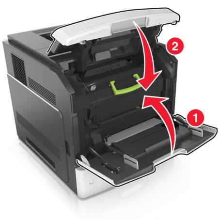 - Lift the front cover, and then pull down the multipurpose feeder door.