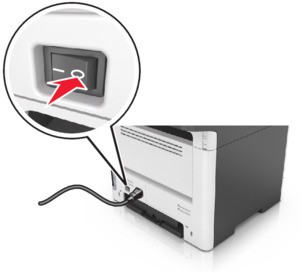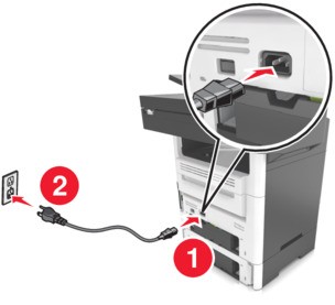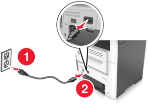 - Connect the power cord to the printer, then to a properly grounded electrical outlet, and then turn on the printer.