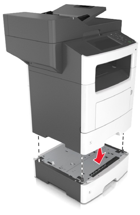 - Align the printer with the tray, and then slowly lower the printer into place.Optional trays lock together when stacked.