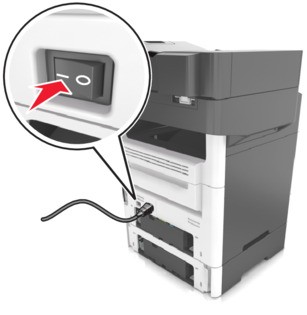 If you are accessing the controller board or installing optional hardware or memory devices sometime after setting up the printer, then turn the printer off, and unplug the power cord from the electrical outlet before continuing. If you have any other devices attached to the printer, then turn them off as well, and unplug any cables going into the printer.
