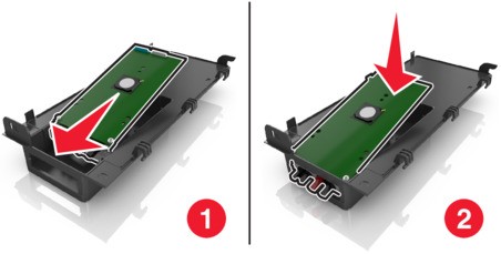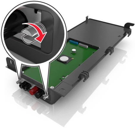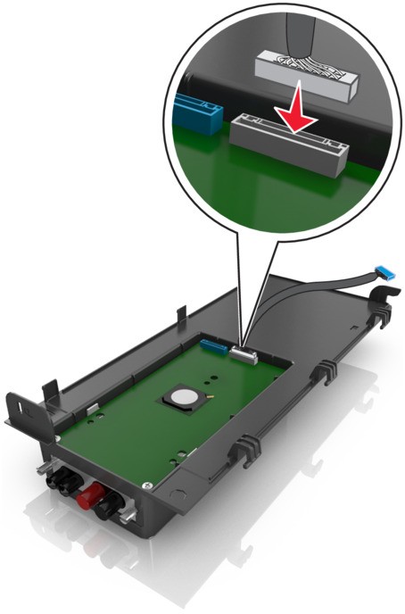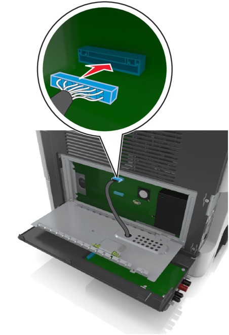Attach the blue plug of the ISP solution interface cable into the blue receptacle on the controller board.If you have installed a printer hard disk, then you need to remove it. For more information, see Removing a printer hard disk. To reinstall the printer hard disk, see Installing a printer hard disk.
