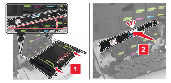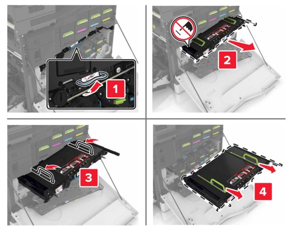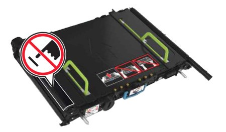 Unpack the new transfer belt, and then remove the packing material.Do not expose the transfer belt to direct light for more than 10 minutes. Extended exposure to light may cause print quality problems.Do not touch the transfer belt. Doing so may affect the print quality of future print jobs.