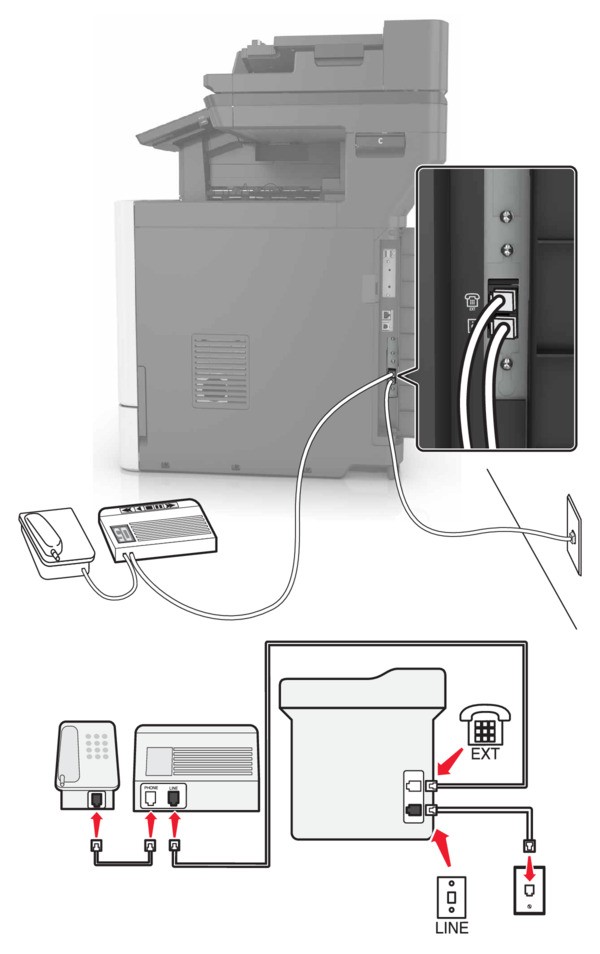 - Connect the answering machine to the telephone port of the printer.