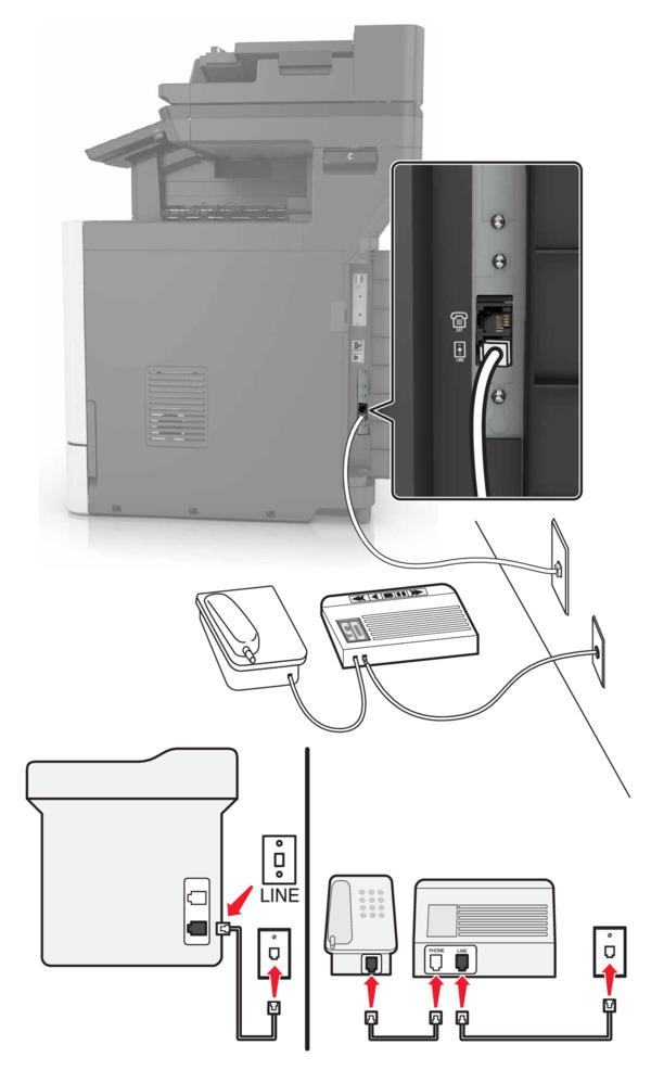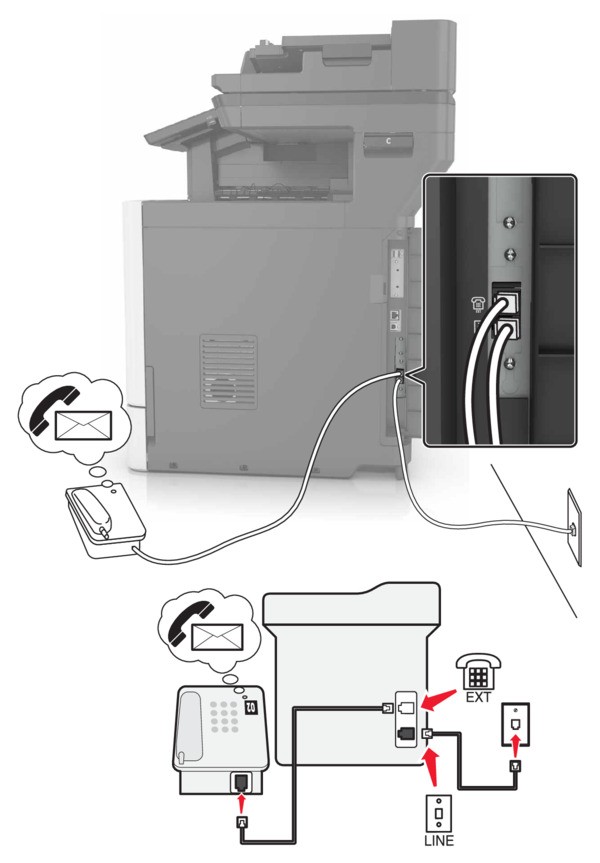 - Connect the telephone to the telephone port of the printer.