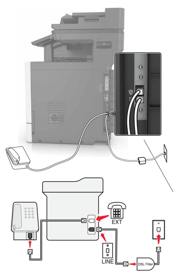 - Connect one end of the telephone cable to the line port of the printer. Connect the other end to the phone port on the DSL filter.
