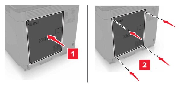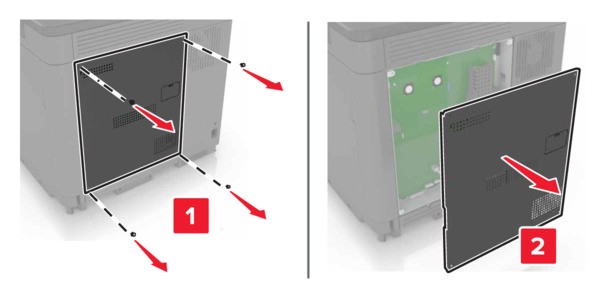 - Turn off the printer, and then unplug the power cord from the electrical outlet.Using a flat‑head screwdriver, remove the controller board access cover.Controller board electronic components are easily damaged by static electricity. Touch a metal surface on the printer before touching any controller board components or connectors.