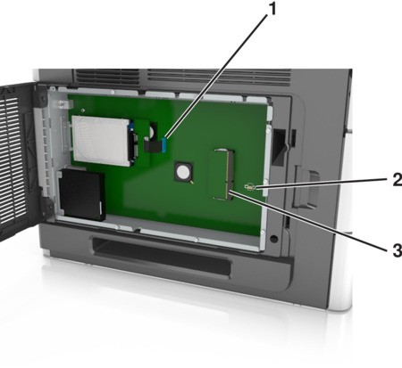1Lexmark™ Internal Solutions Port or printer hard disk connector2Option card connector3Memory card connectorReattach the shield, and then align the screws with the holes.