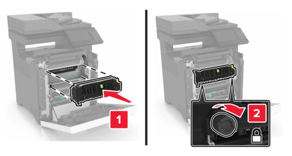 Close doors D and A.Connect the power cord to the electrical outlet, and then turn on the printer.To avoid the risk of fire or electrical shock, connect the power cord to an appropriately rated and properly grounded electrical outlet that is near the product and easily accessible.Reset the fuser maintenance counter.For more information, see Resetting the maintenance counter.