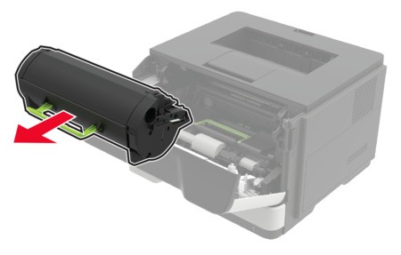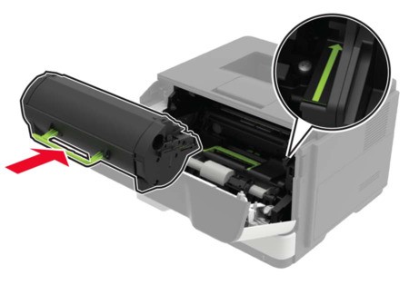 - Insert the toner cartridge.Use the arrows inside the printer as guides.