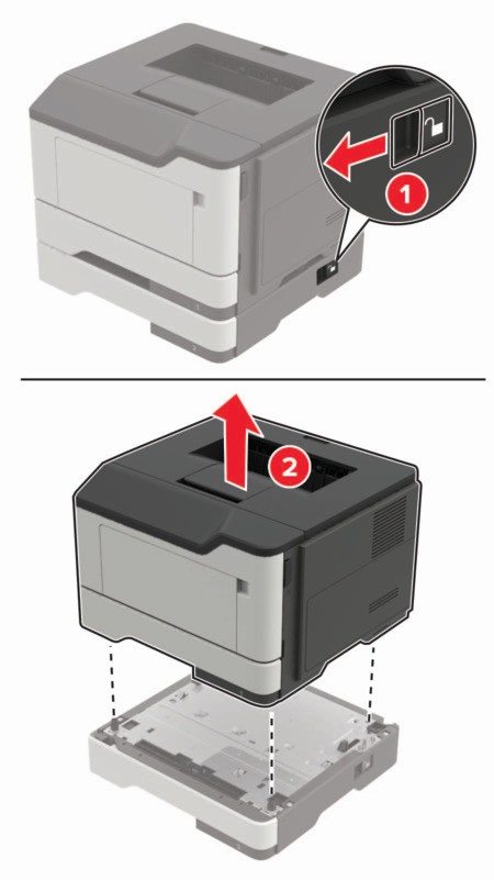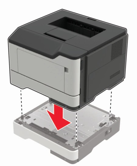 Flip the tray base, and then insert the tray insert.Align the printer with the optional tray, and then lower the printer until itclicksinto place.