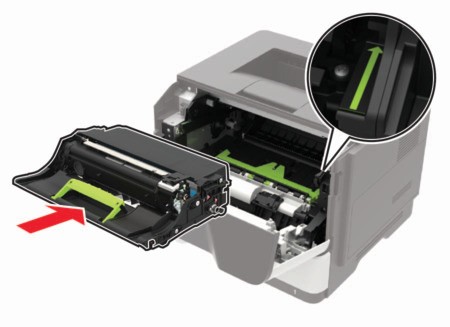 - Insert the new imaging unit.Use the arrows inside the printer as guides.