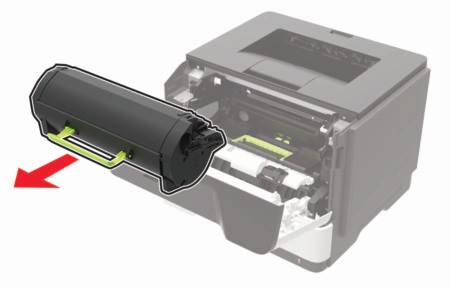 - Insert the toner cartridge.Use the arrows inside the printer as guides.