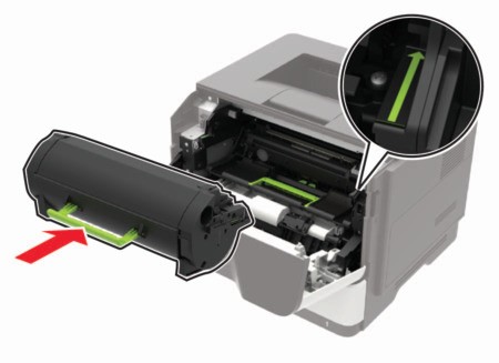 - Insert the toner cartridge.Use the arrows inside the printer as guides.