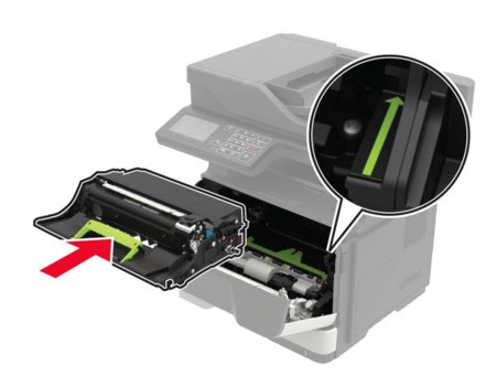 - Insert the new imaging unit.Use the arrows inside the printer as guides.