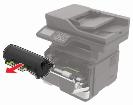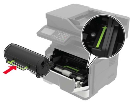 - Insert the toner cartridge.Use the arrows inside the printer as guides.